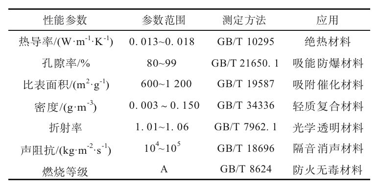 表1 二氧化硅氣凝膠的典型性能參數(shù)及應(yīng)用