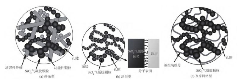 二氧化硅氣凝膠復(fù)合材料可分為4大類:摻雜型硅基氣凝膠復(fù)合材料、涂層型硅基氣凝膠復(fù)合材料、互穿網(wǎng)絡(luò)型硅基氣凝膠復(fù)合材料以及組合型硅基氣凝膠復(fù)合材料,微結(jié)構(gòu)示意見圖2。組合型硅基氣凝膠絕熱復(fù)合材料是將第二相材料以摻雜、涂層或互穿網(wǎng)絡(luò)的形式組合在一起,以發(fā)揮3種復(fù)合改性材料的優(yōu)點,克服缺點,形成綜合性能更佳、適用性更好的復(fù)合材料。