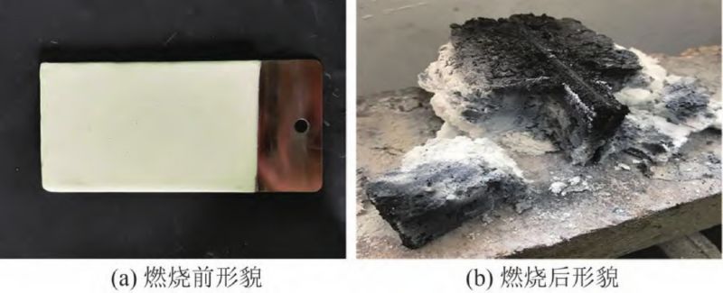 二氧化硅氣凝膠復(fù)合涂料通過利用二氧化硅氣凝膠不同的特性,并添加顏填料、助劑等使其具備不同的功能。圖4(a)是納米孔隙結(jié)構(gòu)的二氧化硅氣凝膠粉體與耐高溫黏結(jié)劑體系復(fù)合制備而成的阻尼膠,將其涂覆于高速列車車體結(jié)構(gòu)金屬板表面,如圖4(b)所示。當(dāng)金屬板受到激發(fā)而產(chǎn)生彎曲振動時,其振動能迅速傳遞給緊密貼合的阻尼涂料,阻尼涂料通過內(nèi)部相應(yīng)錯動和摩擦,使振動能量變?yōu)闊崮芏鴵p耗,起到減振降噪的作用。將二氧化硅氣凝膠分散在專用高性能樹脂乳液中可以制備水性涂料,其性能參數(shù)如下:熱導(dǎo)率 0. 031 W/(m·K),密度 120 kg/m3,阻燃性 V0 級,附著力 1. 2 MPa,憎水率不低于 98%。涂料被有效應(yīng)用在高速列車車體上,可以達到結(jié)構(gòu)減振降噪、隔熱和表面防護的目的,實現(xiàn)冬夏季隔熱保溫,降低空調(diào)能耗等作用。圖5 是鋼結(jié)構(gòu)用氣凝膠防火涂料燃燒前后對比。此涂料厚度為3. 0 mm 時,耐火極限時間達2 h(一般防火涂料厚度需要3. 5 mm);與鋼板、鋁板等金屬材料附著力強,黏結(jié)強度大于1. 0 MPa;燃燒后金屬板材不變形、不燒蝕,被應(yīng)用于高速列車的承重鋼結(jié)構(gòu)件保護, 可有效阻止火勢失控蔓延。