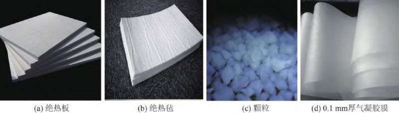 高速列車因運行環(huán)境變化大、時速高、廂體夾層空間狹小,設(shè)計時青睞于高性能(如保溫隔熱、防火防爆、減振吸能、隔音降噪等)材料。二氧化硅氣凝膠復(fù)合材料具有輕質(zhì)、絕熱、隔音、阻燃、疏水以及環(huán)保等優(yōu)異性能,在未來高速列車車體優(yōu)化設(shè)計中具有廣泛的潛在應(yīng)用價值。目前主要的二氧化硅氣凝膠復(fù)合制品有絕熱板、絕熱氈、涂料、膜、顆粒、紙和異形件等,部分復(fù)合制品如圖3 所示。