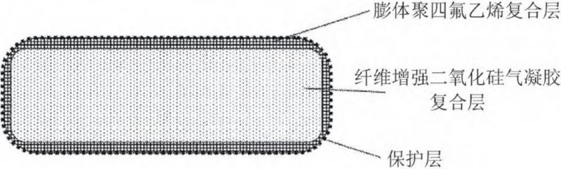 二氧化硅氣凝膠與玻璃纖維、陶瓷纖維或者碳纖維等復(fù)合后得到氈類制品,雖隔熱效果較好,但是表面纖維容易斷裂、粉化,造成浮纖或粉末污染。為解決該問題,可將氣凝膠復(fù)合層的外部覆蓋一層更高強度、高韌性的材料,如膨體聚四氟乙烯和阻燃聚對苯二甲酸乙二醇酯纖維的復(fù)合層,如圖7 所示。