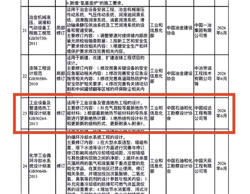 日前,住房城鄉建設部印發建標函〔2024〕41號文“關于印發2024年工程建設規范標準編制及相關工作計劃的通知”,下達了GB 50264-2013《工業設備及管道絕熱工程設計標準》國家標準修訂計劃,項目由中國成達工程有限公司等單位牽頭,計劃要求于2026年6月完成。